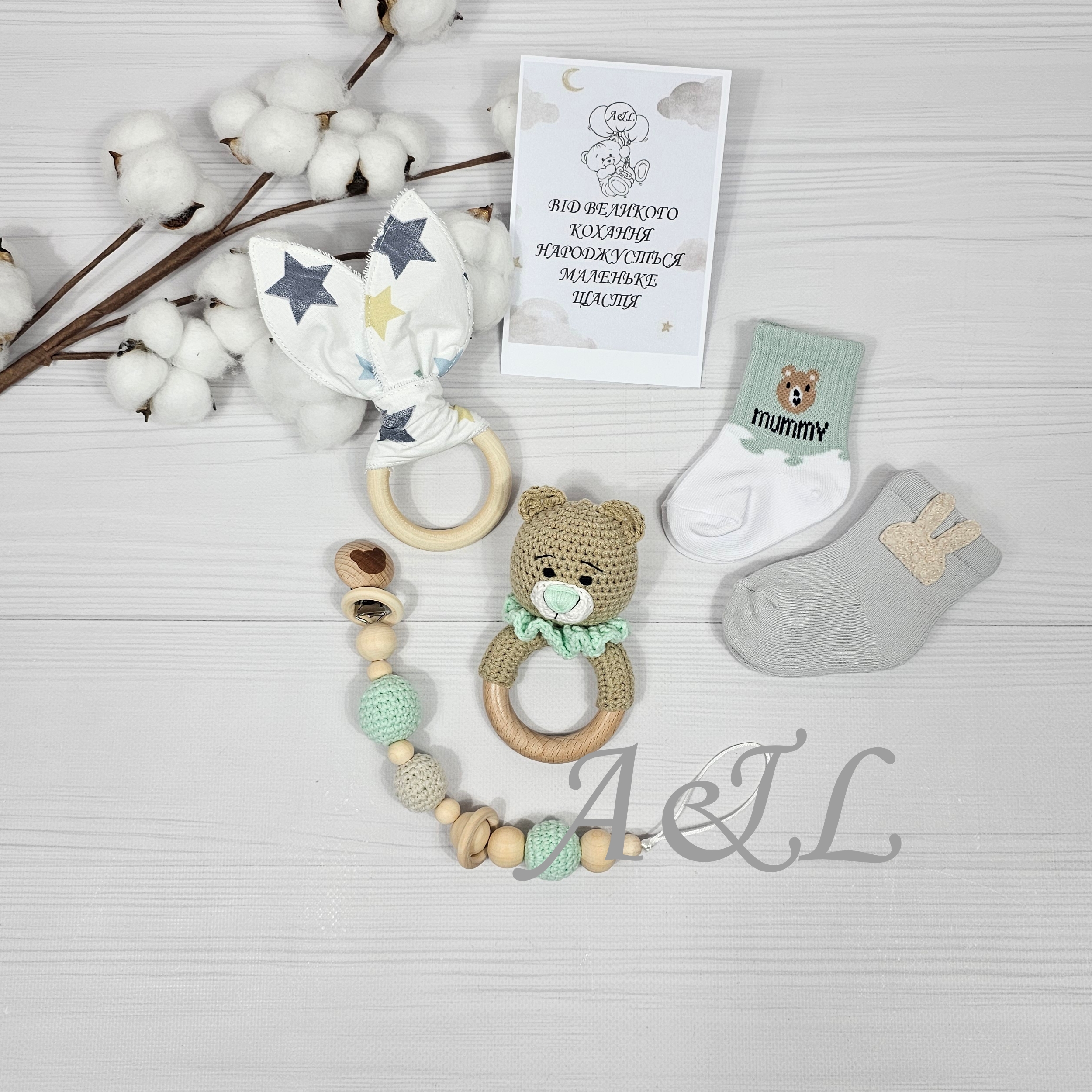 Ніжний набір для немовляти в біло-зелених відтінках із принтамиавокадо. У комплект входять, муслінова серветка, дерев’яні гризунці, шкарпетки, і аксесуари.