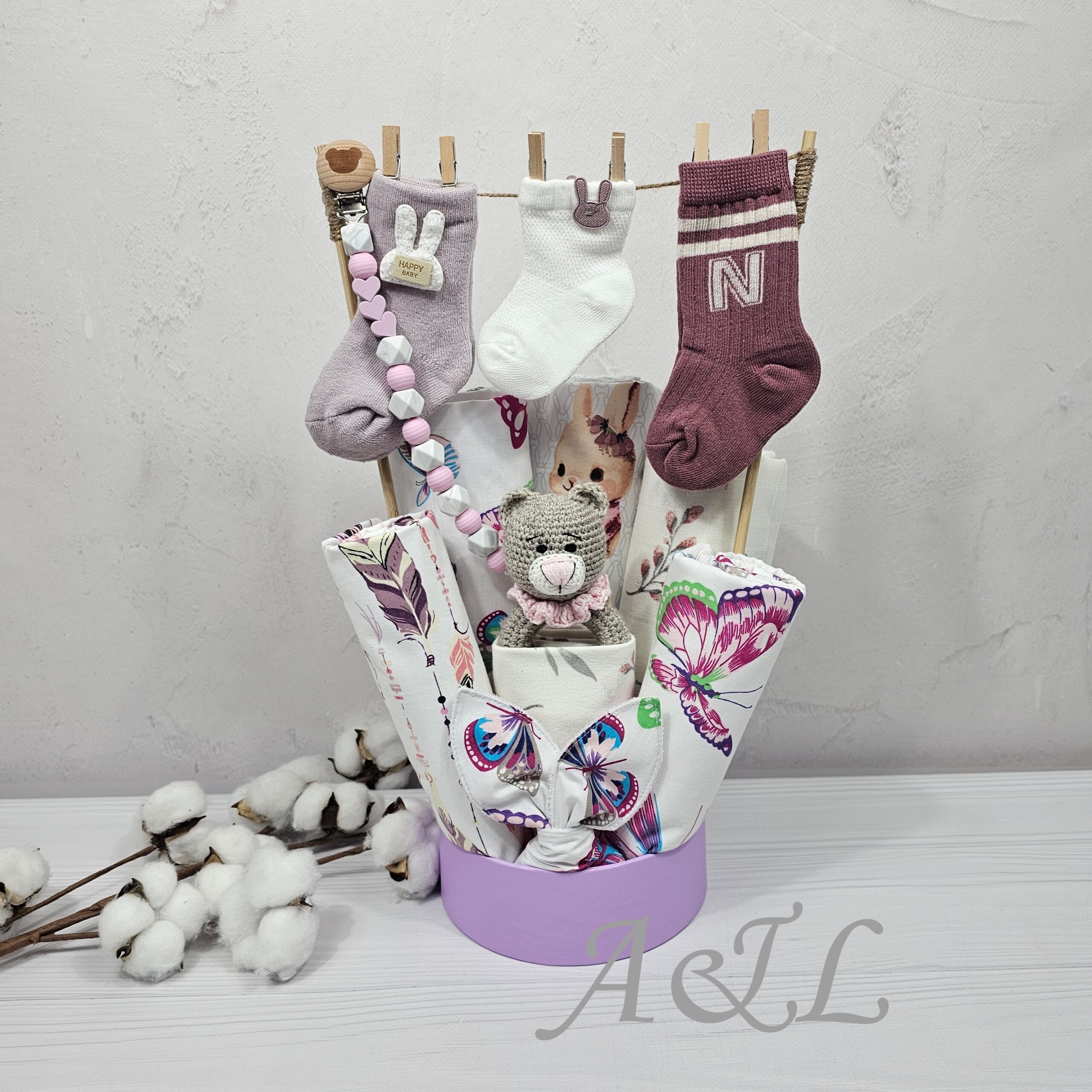 Букет для немовлят з пелюшок “Метелики”— Ми створили цей бокс із турботою про найменших, вклавши у нього тепло, любов та практичність. Це набір, який допоможе зробити перші дні з малюком максимально комфортними, м’якими та спокійними. Ідеальний подарунок для новонародженого, на виписку, хрестини або просто як прояв теплих почуттів до молодої мами.