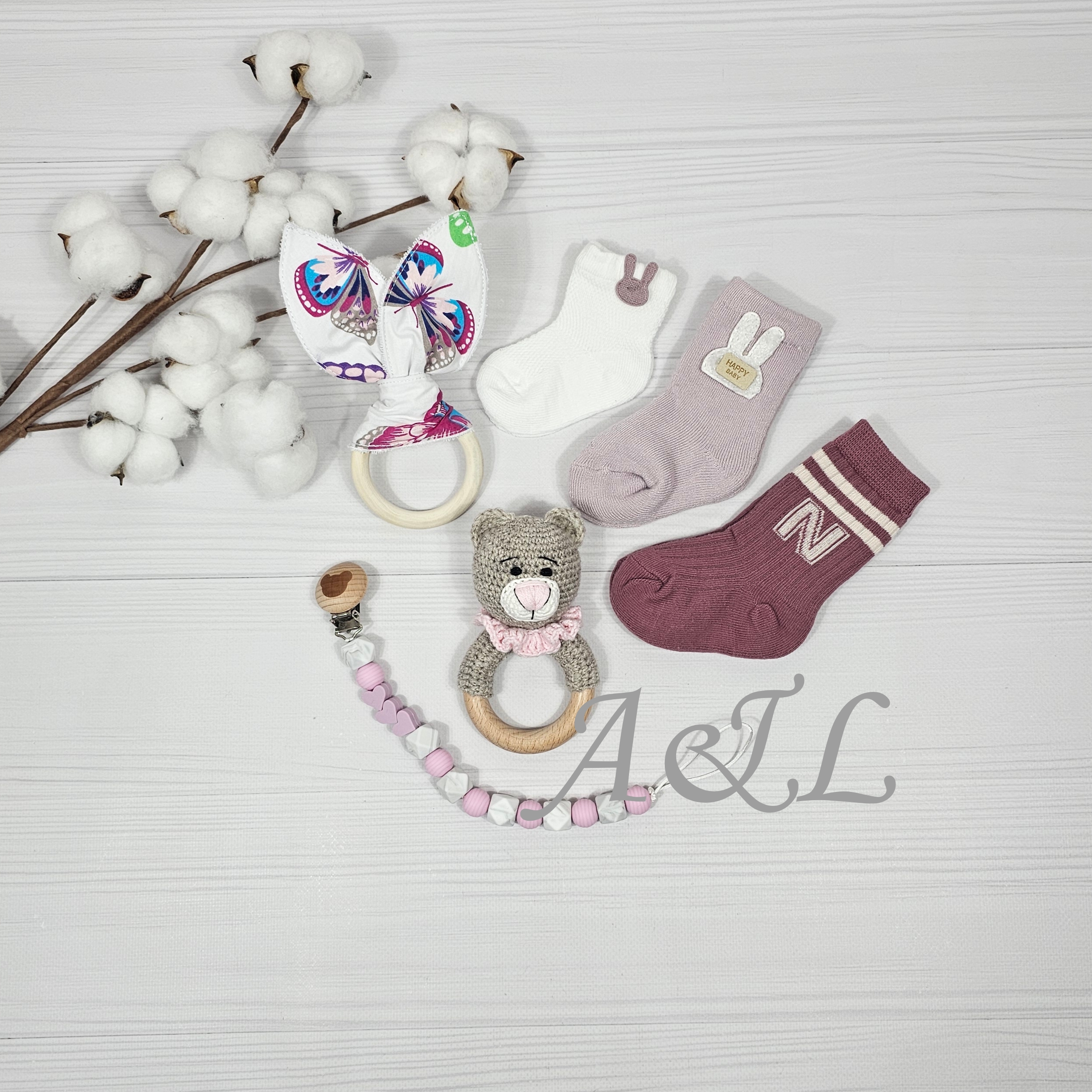 Усі елементи виготовлені з натуральних та безпечних матеріалів. Букет виглядає дуже естетично та стильно, а його вміст дійсно стане у пригоді в перші місяці життя малюка.