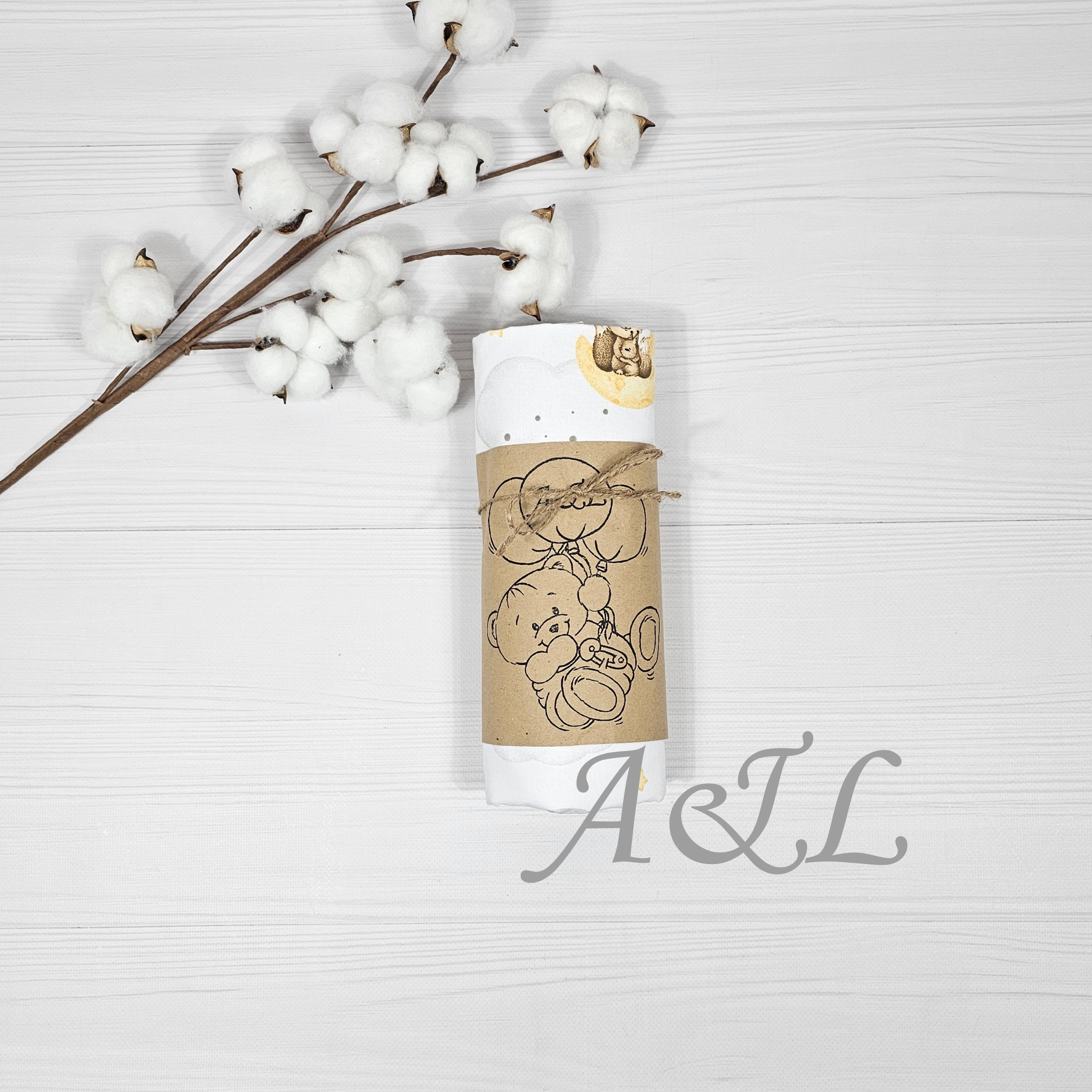 Непромокаюча пелюшка з принтом звірят на хмаринках та місяці, запакована в тубус із крафтовим папером та малюнком ведмедика який є логотипом виробника