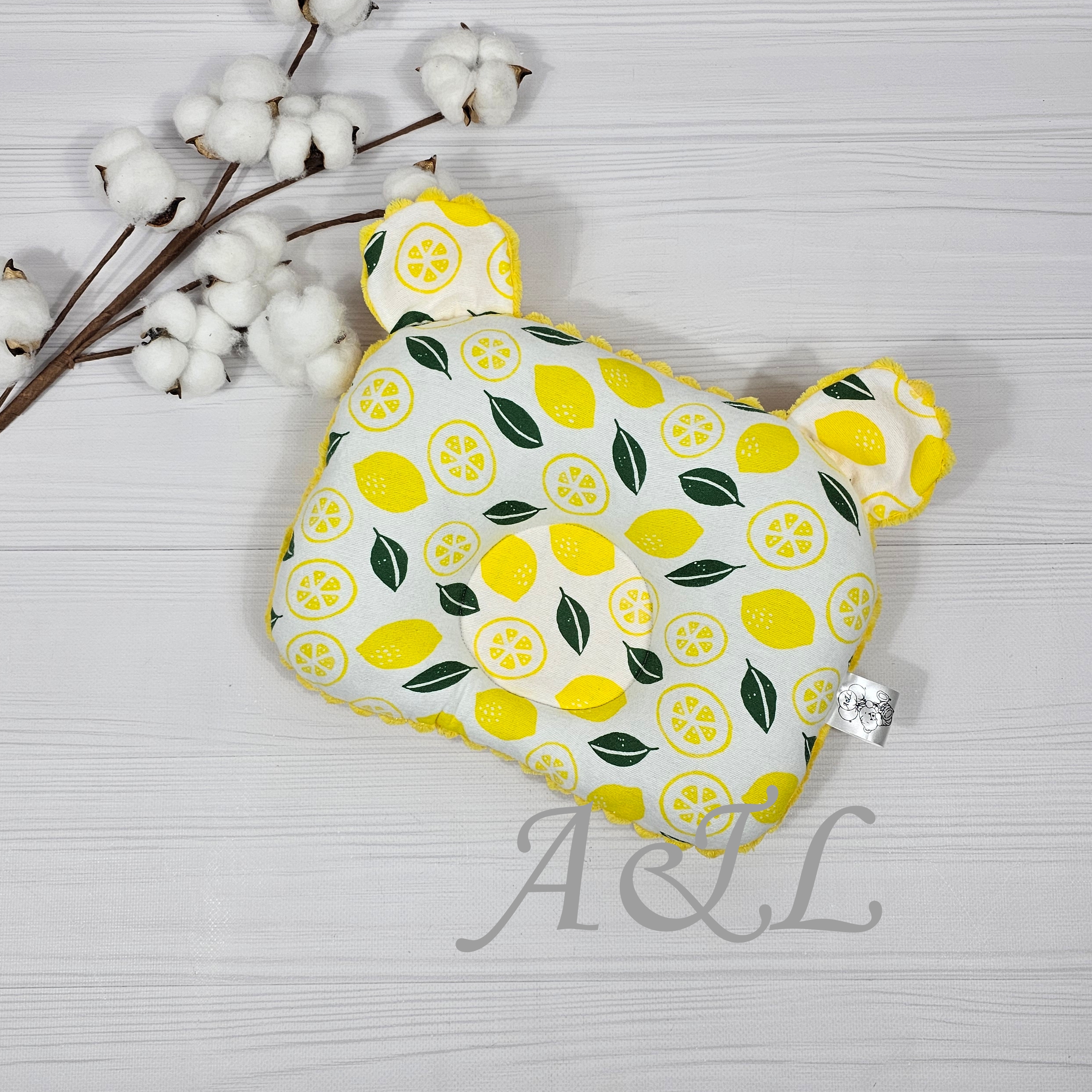 Дитяча подушка у формі ведмедика з візерунком лимончик на білому фоні