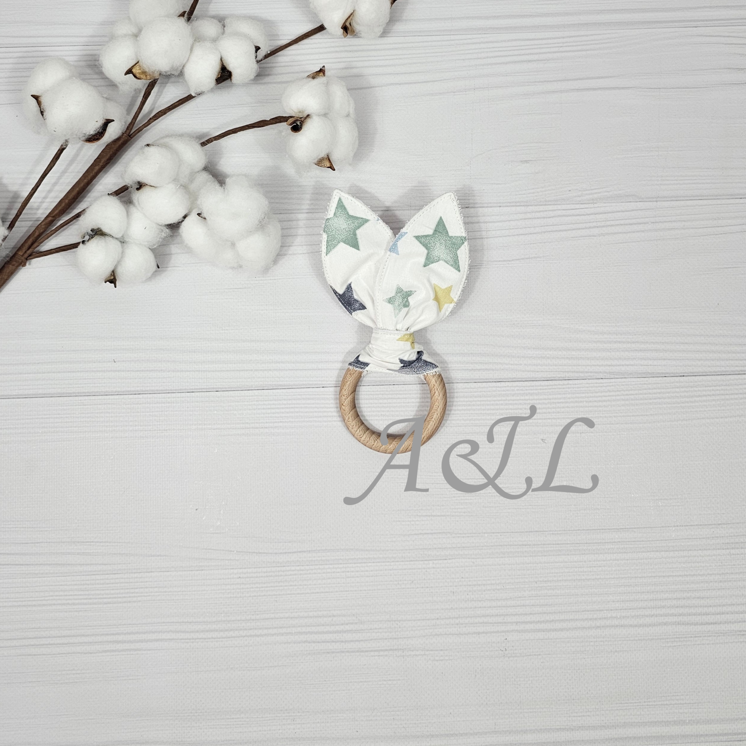 Дитячий Еко гризунок «Шарудливі вушка» з тримачем, гризункць із текстильною частиною у формі вушок та дерев'яними елементами, та тримач для соски з в'язаними та дерев'яними намистинами