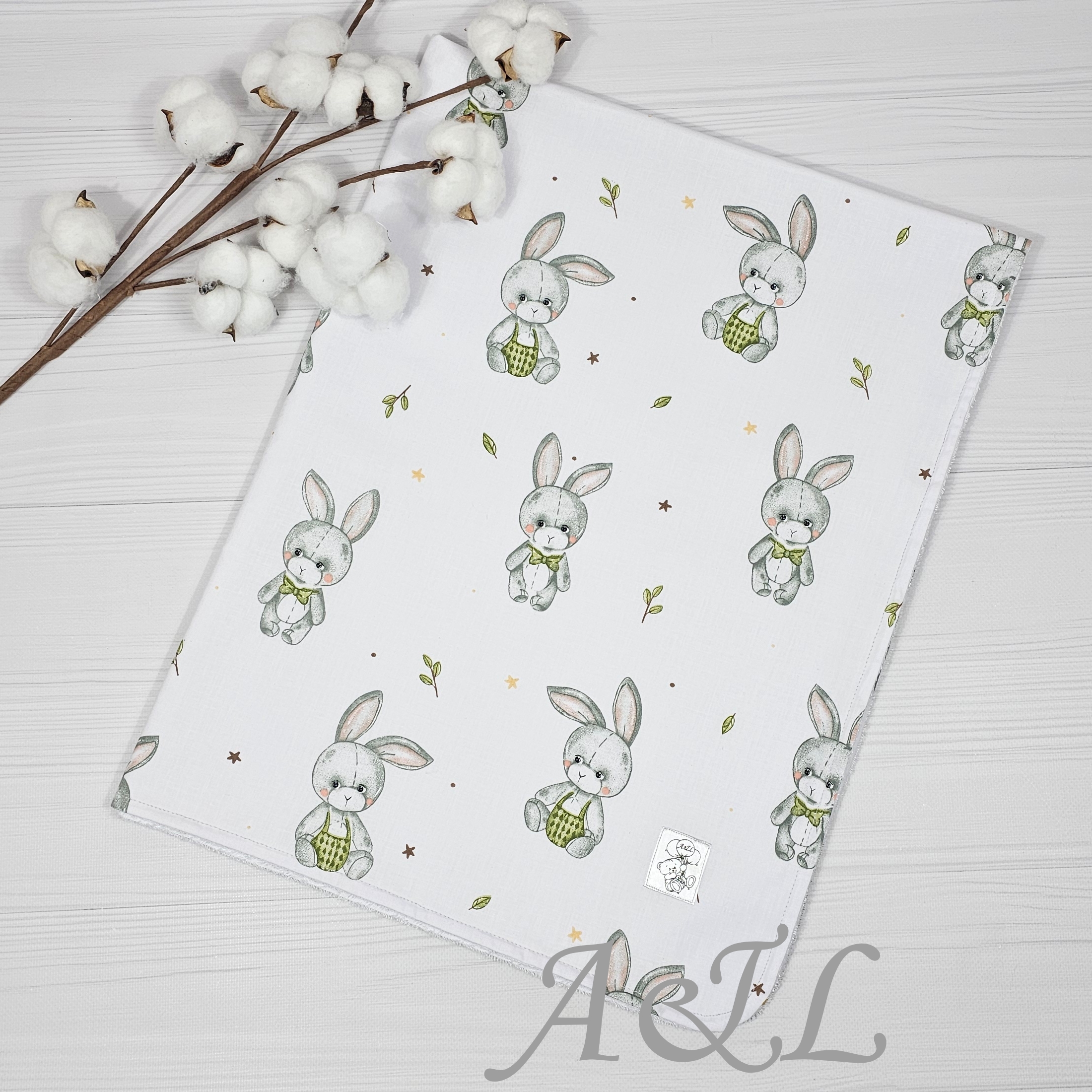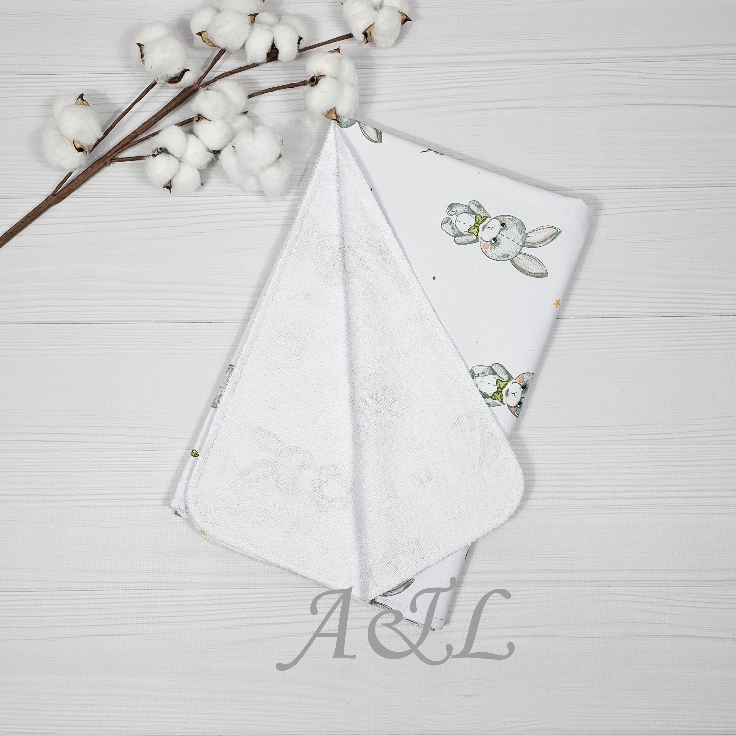 Непромокаюча пелюшка з принтом зайчикиз зеленими комбенізонами, розгорнута на якій зображено зворотню махрову сторону пелюшки.