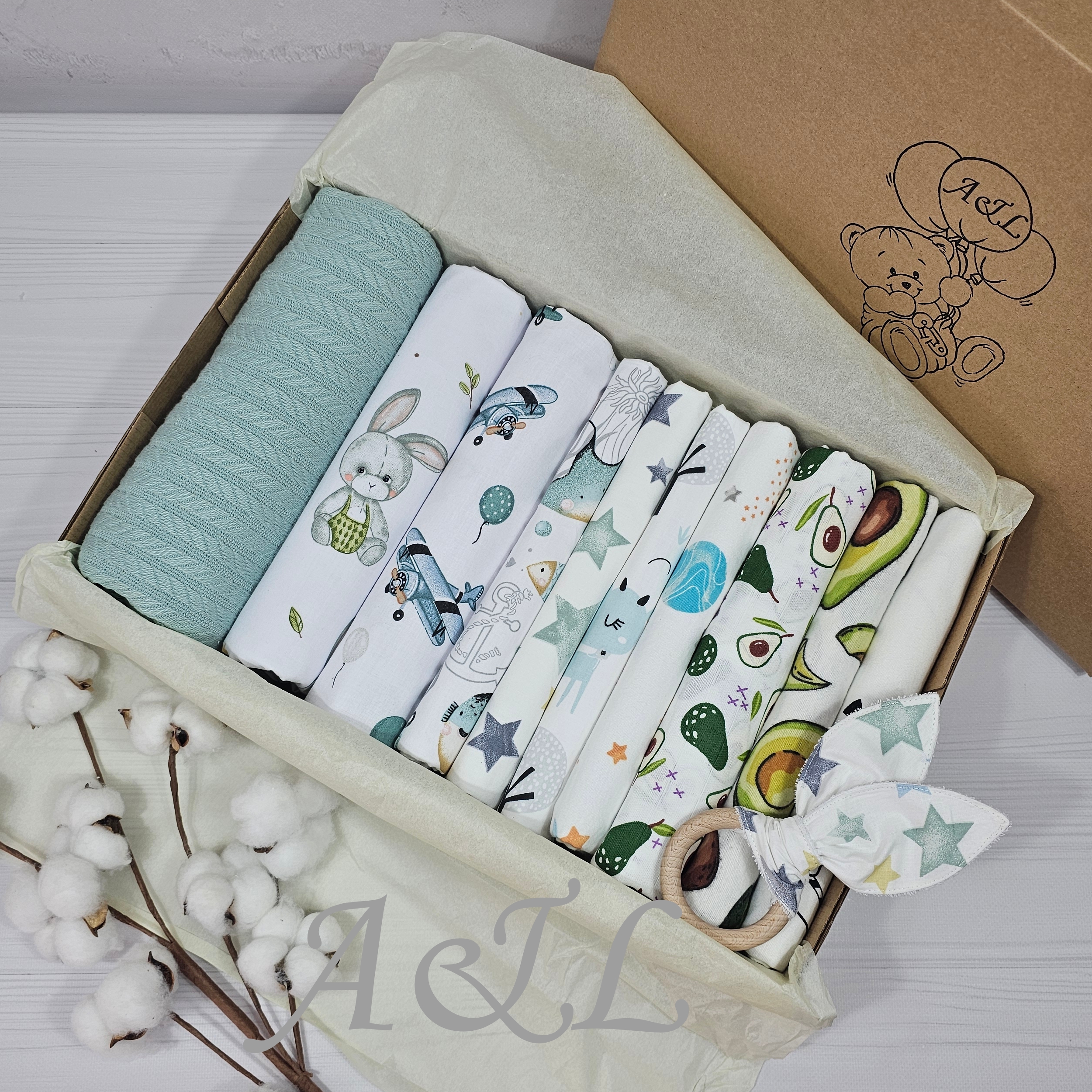 Подарунковий набір пелюшок з пледом із в'язаного полотна, дитячими текстильними виробами у подарунковій коробці.